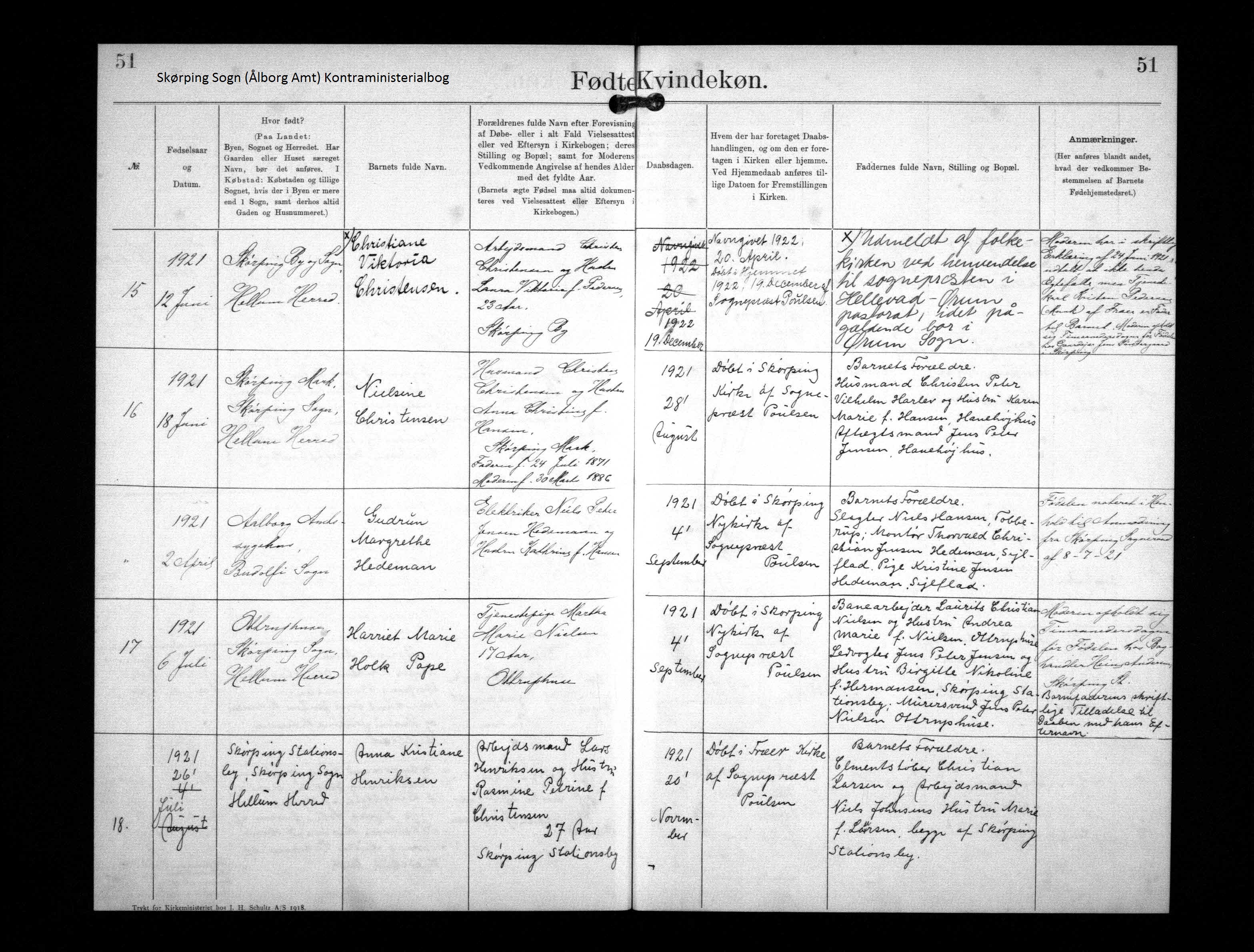 Noter : KB-1921 Skørping Sogn (Aalborg amt), Kontraministerialbog nr.16 Født 18 Jun 1921 Nielsine Christensen, Skørping Mark, Skørping Sogn, Hellum Herred. Forældre: Husmand Christen Christensen f. 24 Juli 1871 og Hustru Anna Christensen f. Hansen 30 Marts 1886, bor Skørping Mark Faddere: Husmand Christen Peter Vilhelm Harlev og Hustru Karen Marie f. Hansen Hanehøjhus. Aftægtmand Jens Peter Jensen Hanehøjhus.