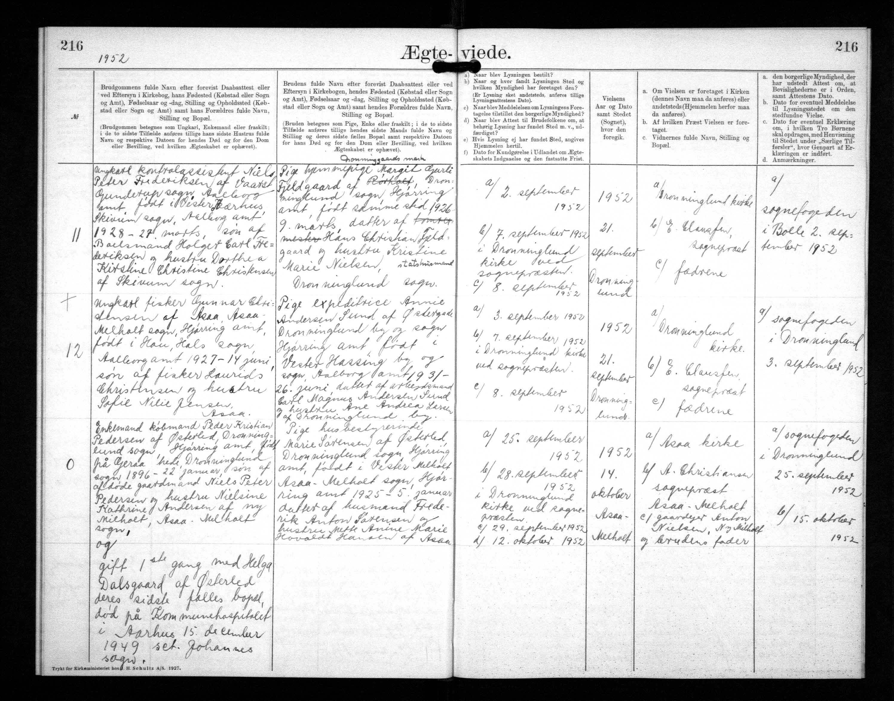 KB-1951 Dronninglund Sogn Kontraministerialbog side 216 Gift 14 oktober 1952 - Aså Melholt Enkemand Købmand Peder Kristian Pedersen af Østerled, Dronninglund Sogn, født på Gjeraa hede, Dronninglund d 22. januar 1896, søn af afdøde gaardmand Niels Peter Pedersen og hustru Nielsine Kathrine Andersen af Ny Milholt, Asaa-Melholt sogn. Pige husbestyrerinde Marie Sørensen af Østerled, Dronninglund, født i Vester Melholt Asaa-Melholt sogn, født 5 januar 1925, datter af husmand Frederik Anton Sørensen og Hustru Mette Anine Marie Hovaldt Hansen af Asaa. Forlover Anton Nielsen, Ny Milholt og Brudens fader